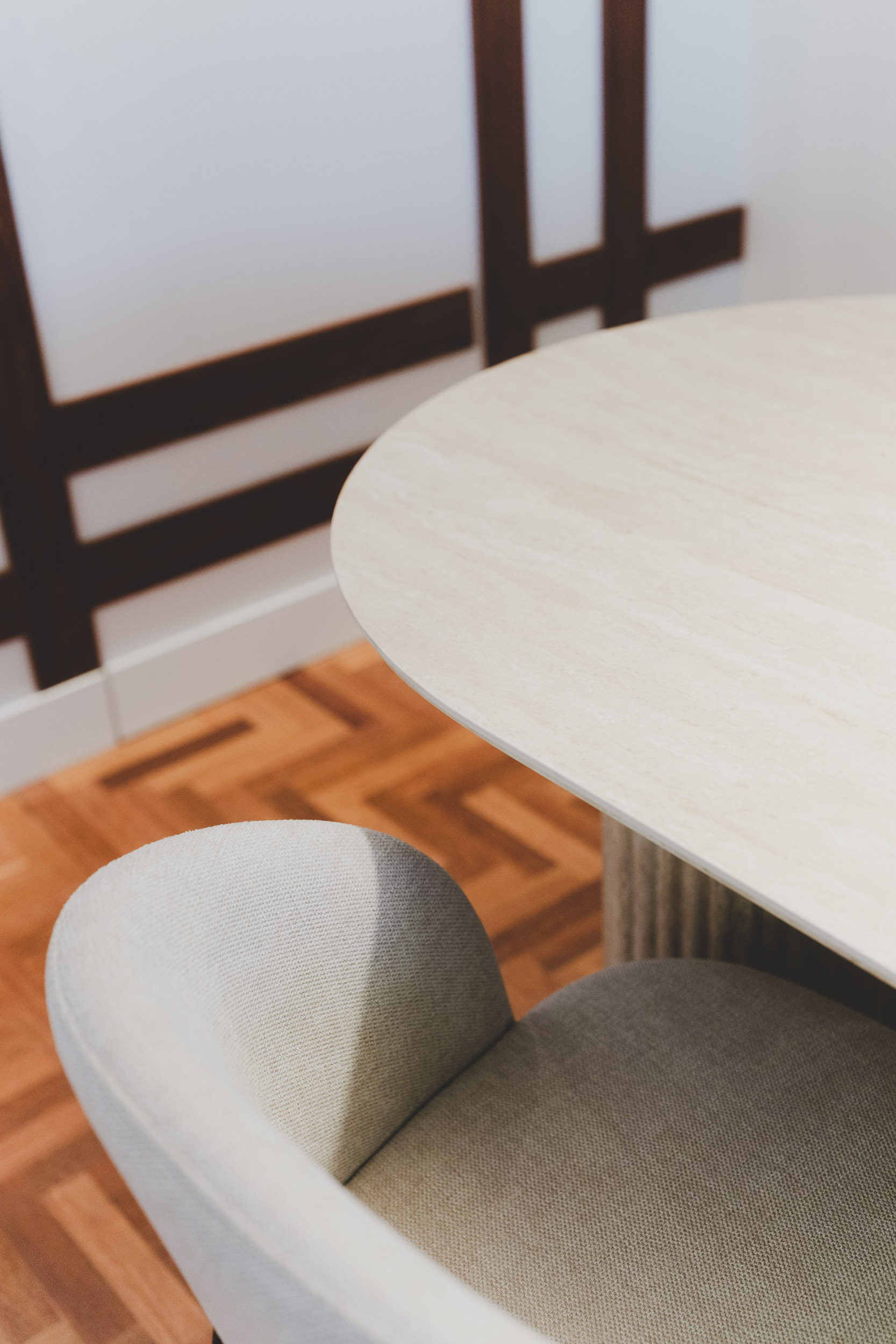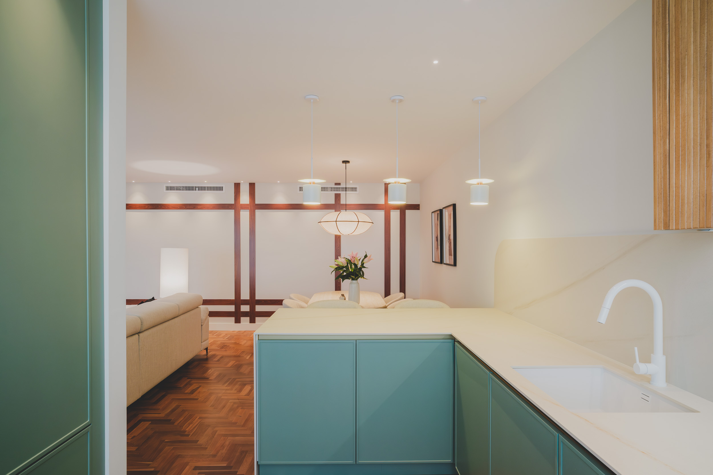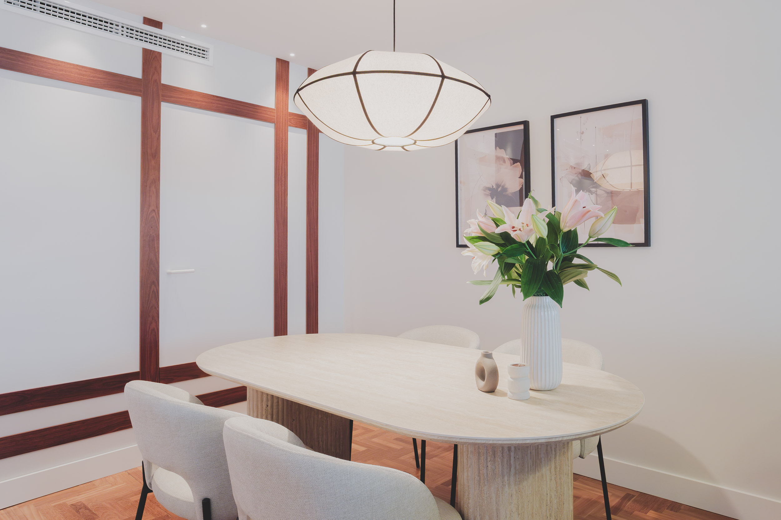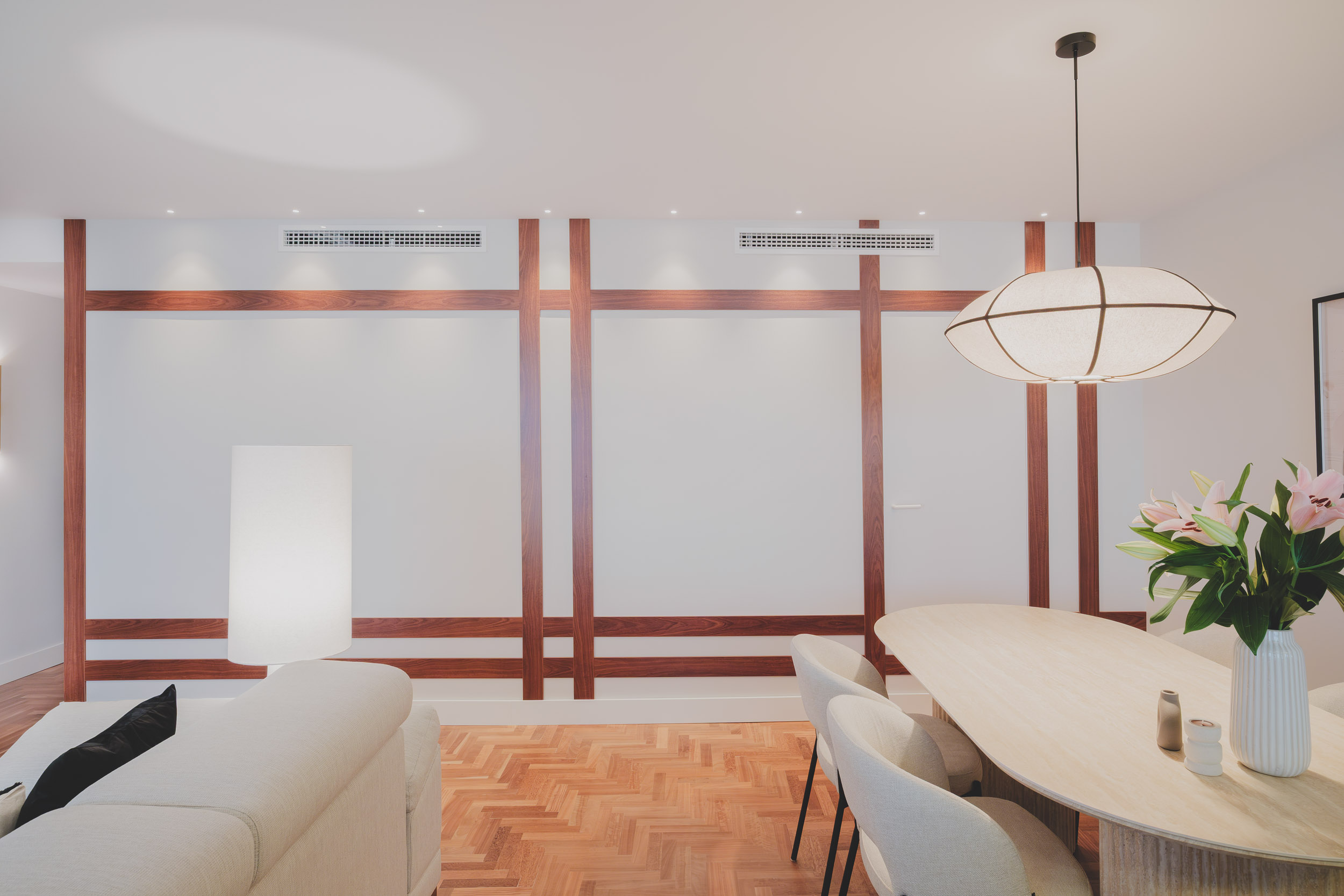La zona social, con cocina abierta, comedor y salón en continuidad, se convierte en el corazón de la casa. Materiales nobles como la madera natural, el travertino y el porcelánico, junto al parquet de jatobá recuperado, aportan calidez y coherencia. La iluminación arquitectónica y el mobiliario a medida refuerzan la verticalidad, la textura y la serenidad del conjunto.
