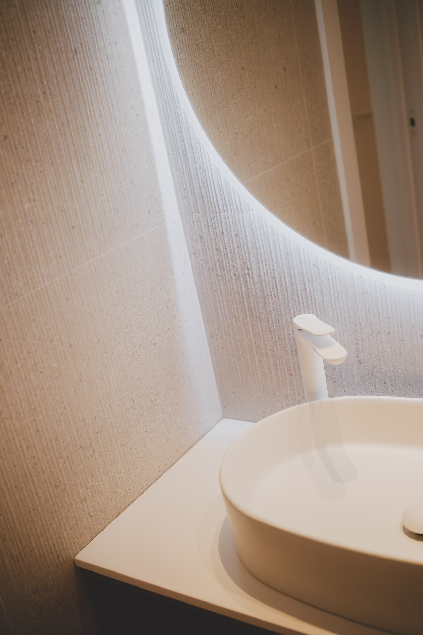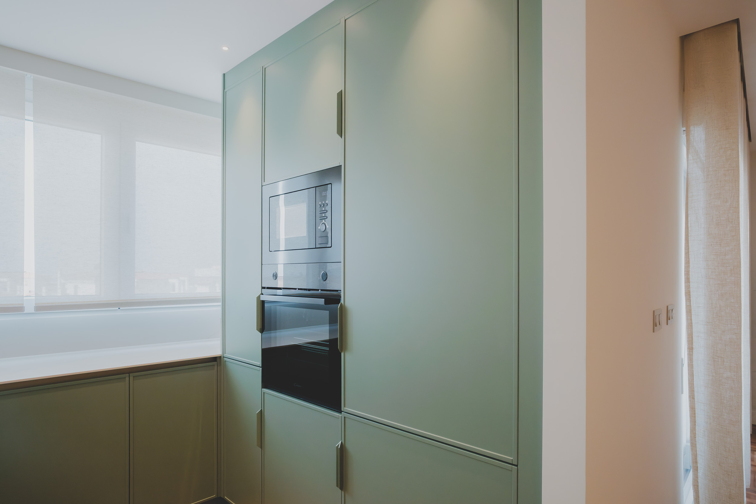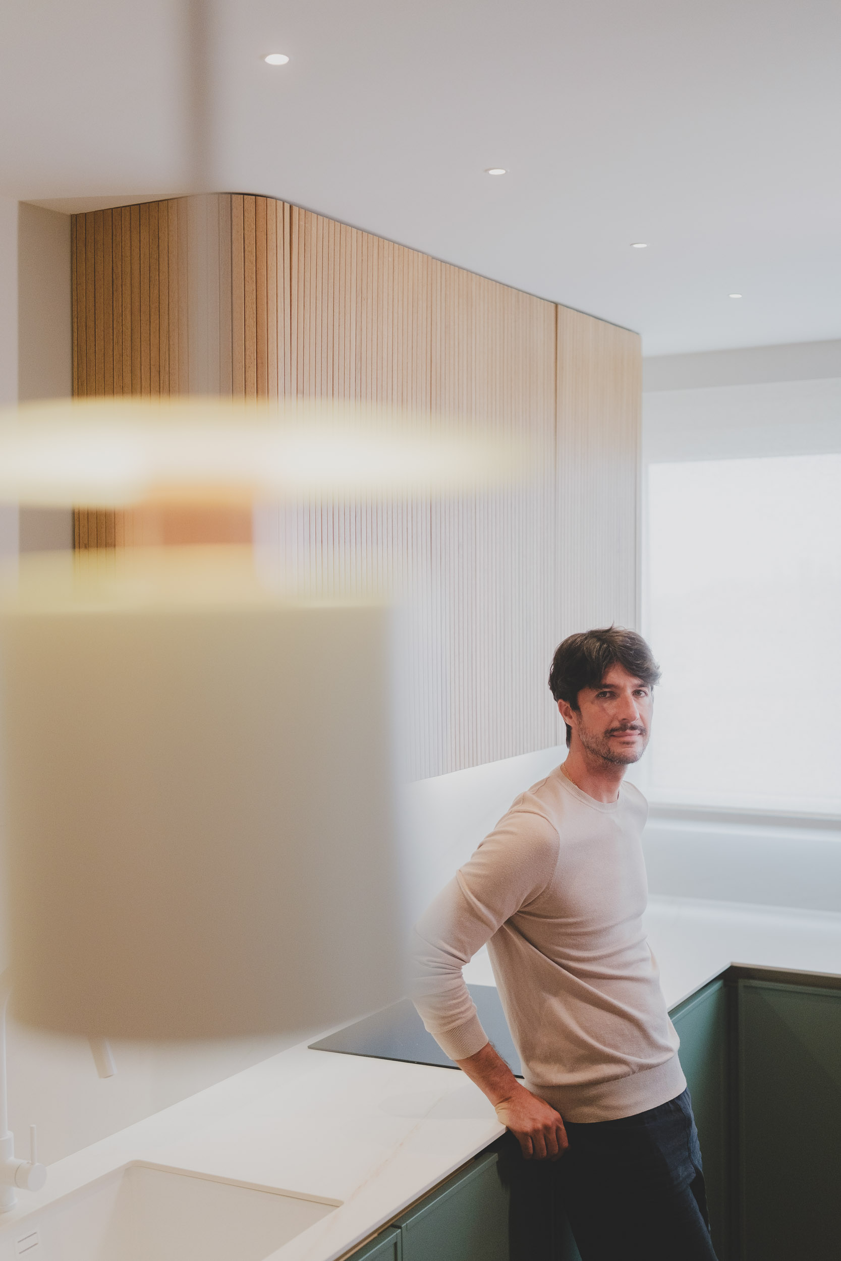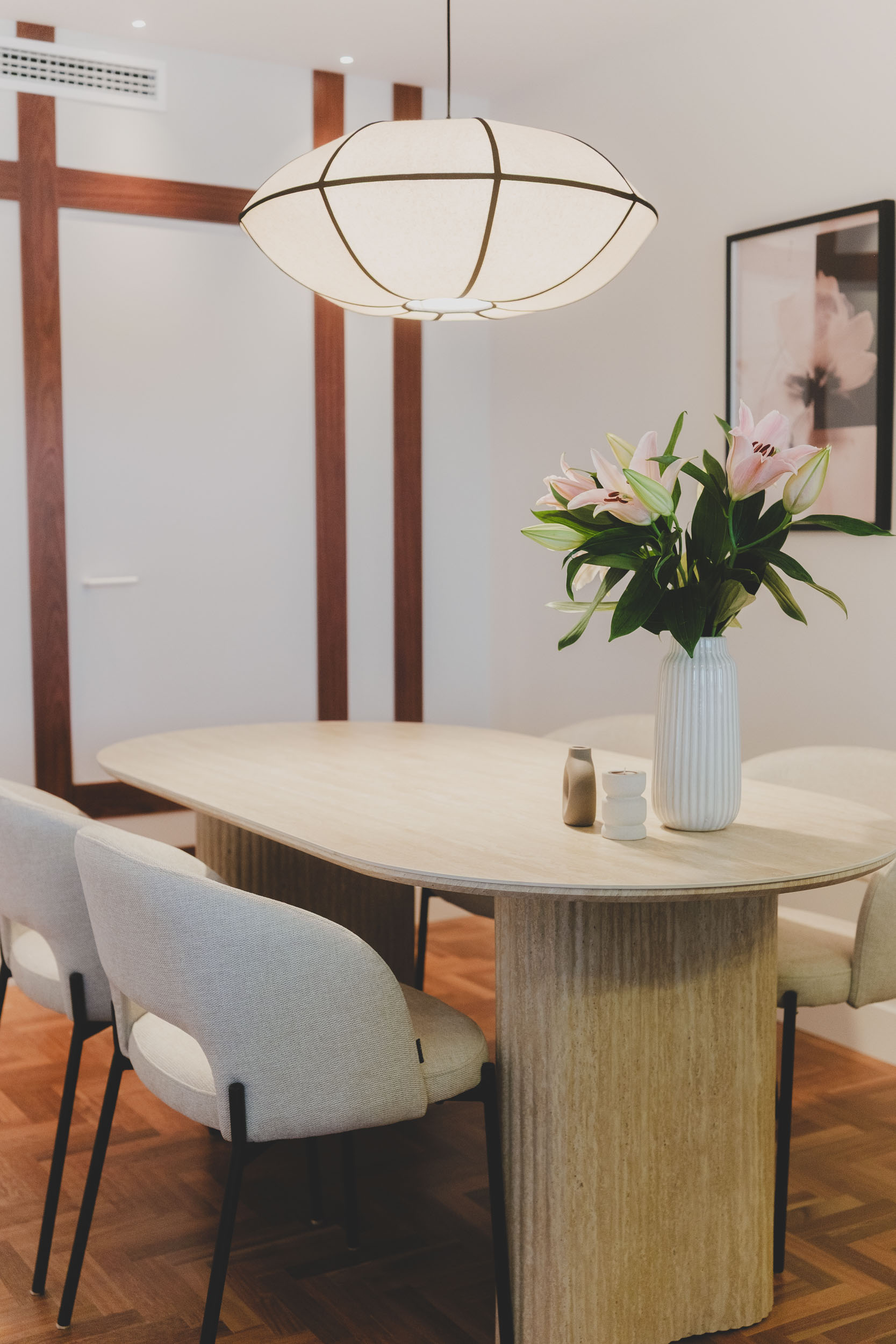 La zona social, con cocina abierta, comedor y salón en continuidad, se convierte en el corazón de la casa. Materiales nobles como la madera natural, el travertino y el porcelánico, junto al parquet de jatobá recuperado, aportan calidez y coherencia. La iluminación arquitectónica y el mobiliario a medida refuerzan la verticalidad, la textura y la serenidad del conjunto.