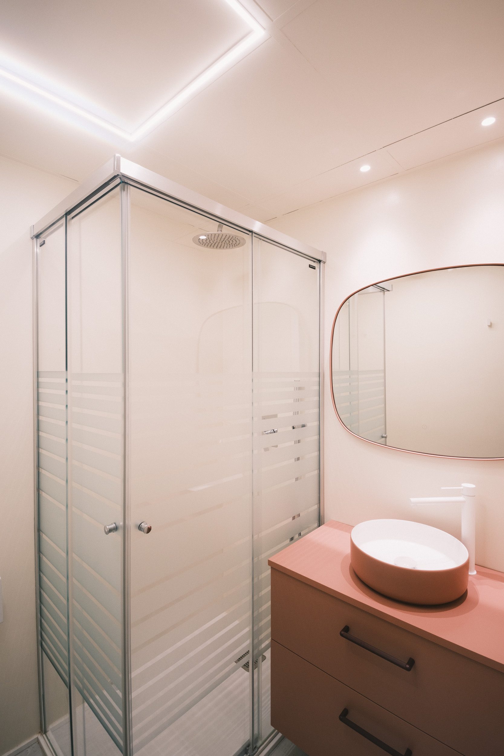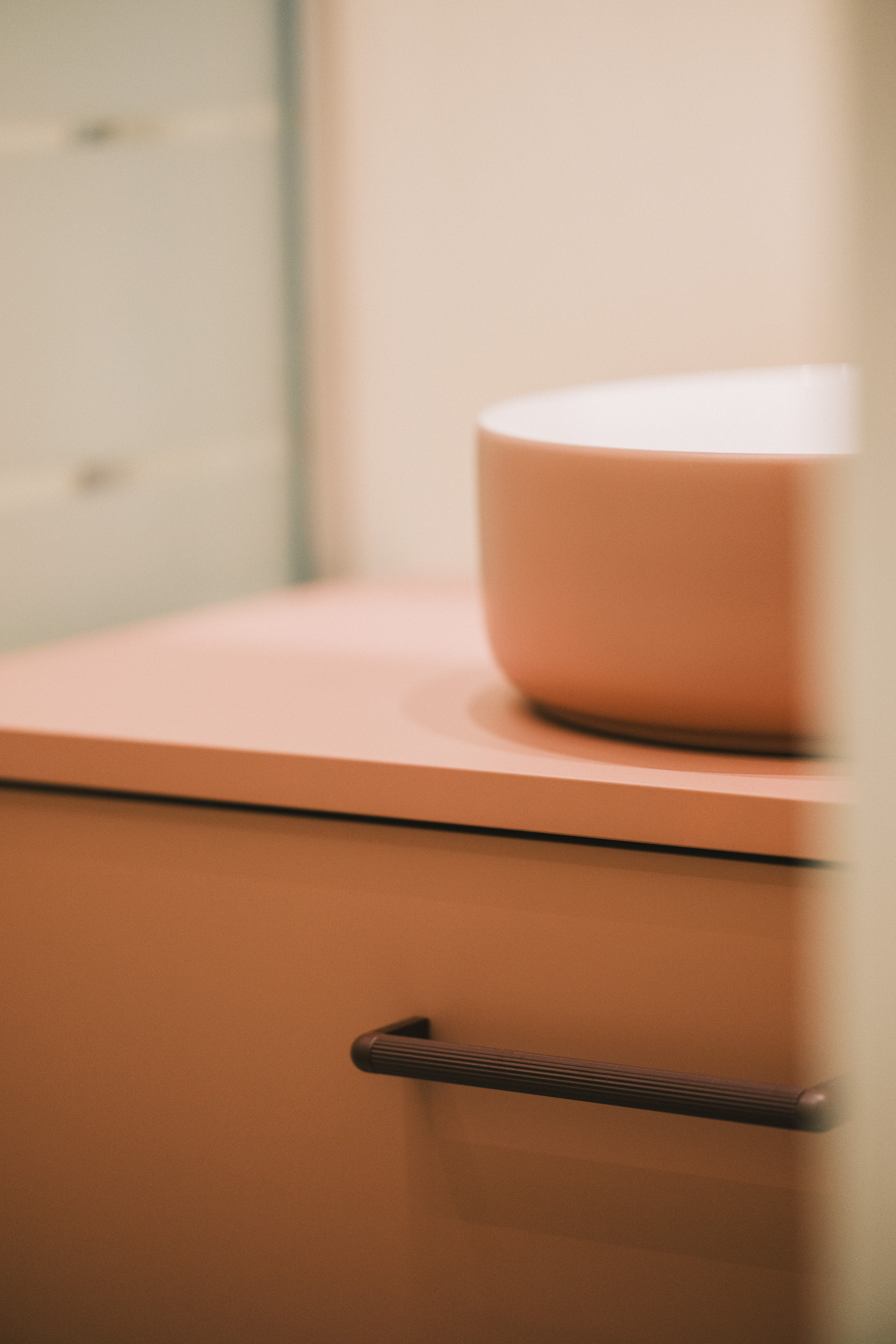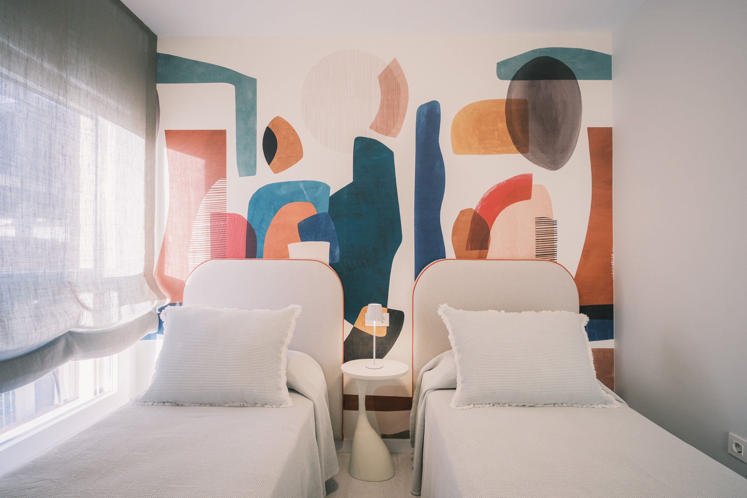 La zona de día se plantea como un espacio abierto donde salón, comedor y cocina conviven en equilibrio, con el color teja como acento lleno de carácter. La iluminación, cuidadosamente estudiada, matiza y acompaña cada ambiente, mientras el despacho y las zonas privadas refuerzan la funcionalidad y el confort. Incluso el baño de invitados demuestra que renovar sin obra es posible gracias a soluciones como el micromortero.