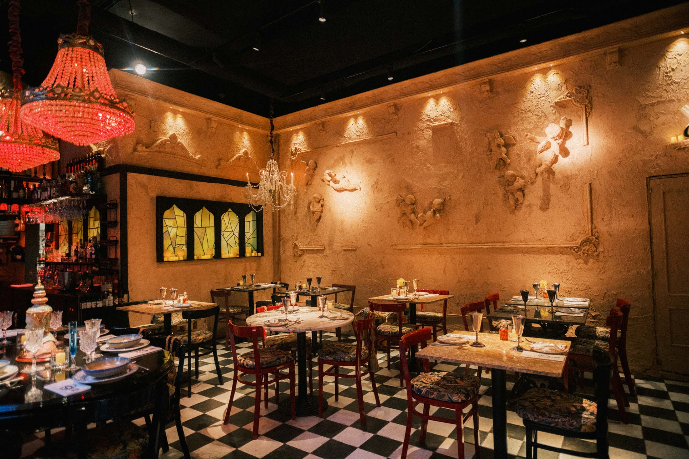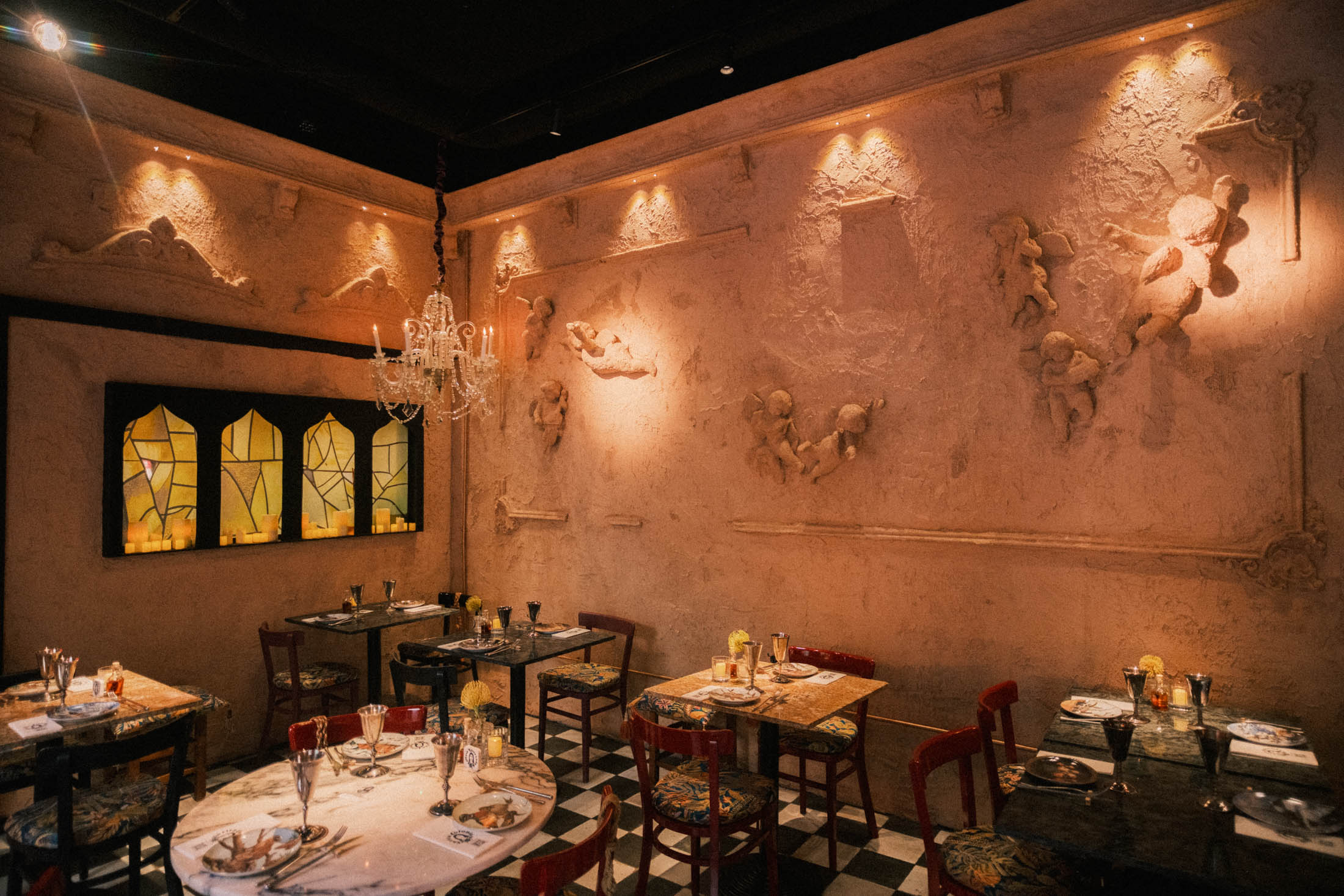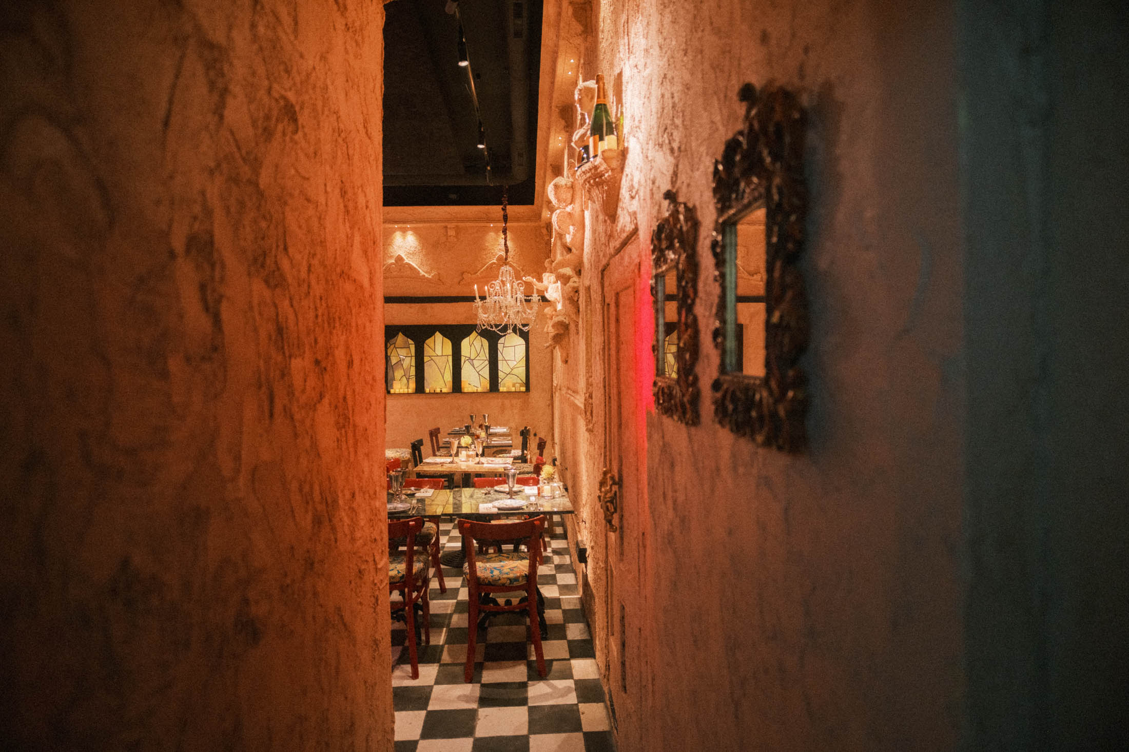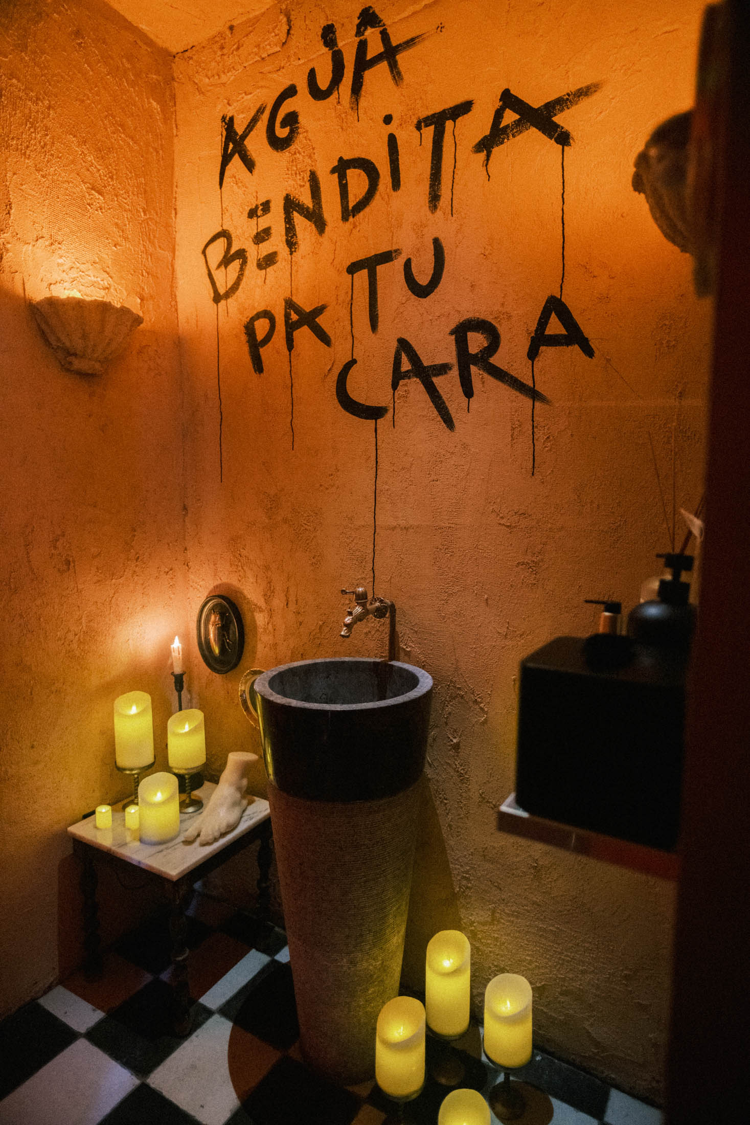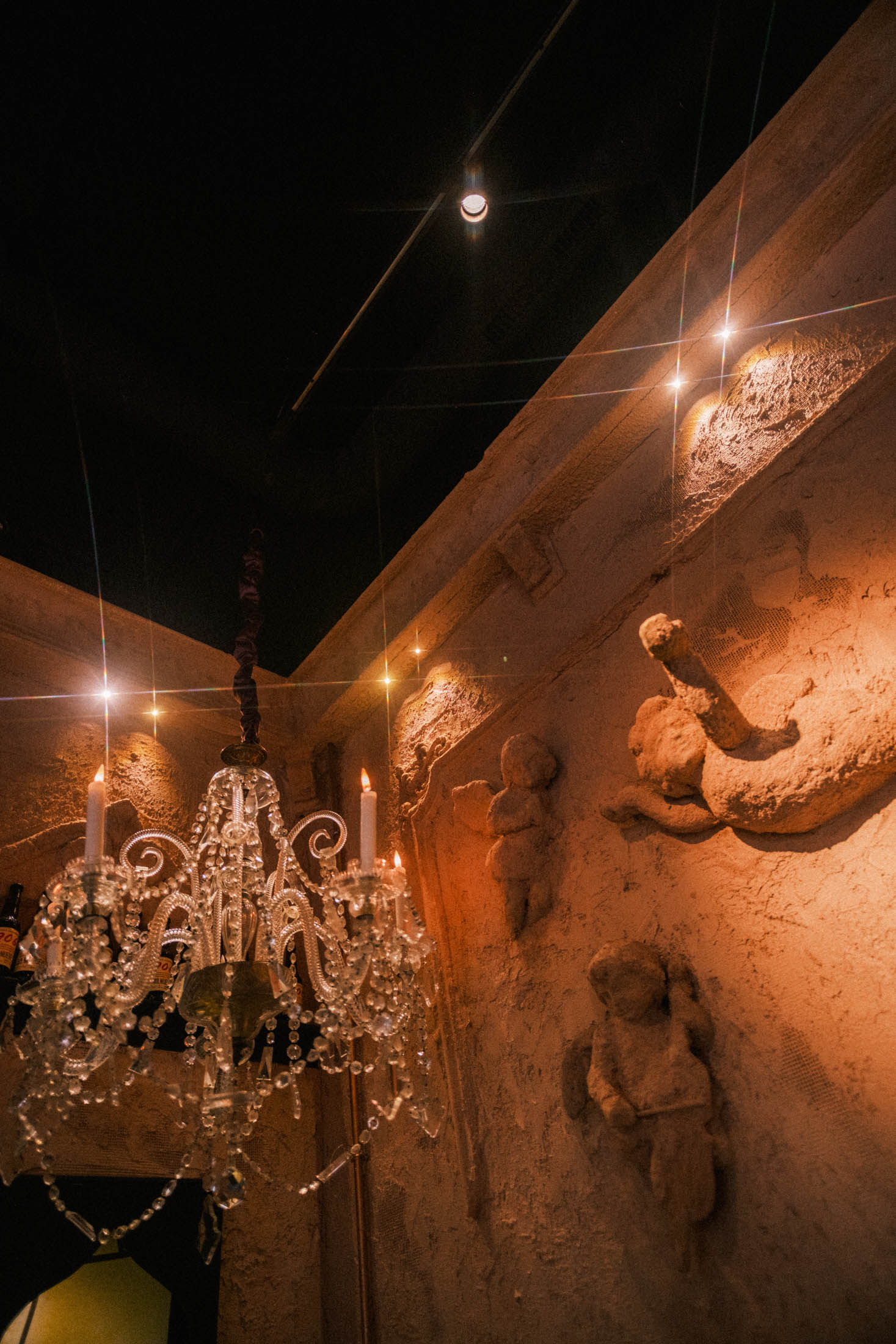 Cada rincón tiene su propia narrativa: la mesa imperial preparada con un menaje cuidado al detalle, el comedor íntimo con ventanales artesonados que conectan la cocina con la sala, o las luminarias isabelinas bañadas en rojo que juegan con lo místico y lo teatral. Los querubines en altorrelieve y el mobiliario diseñado a medida completan una atmósfera única, donde todo está pensado para sorprender.