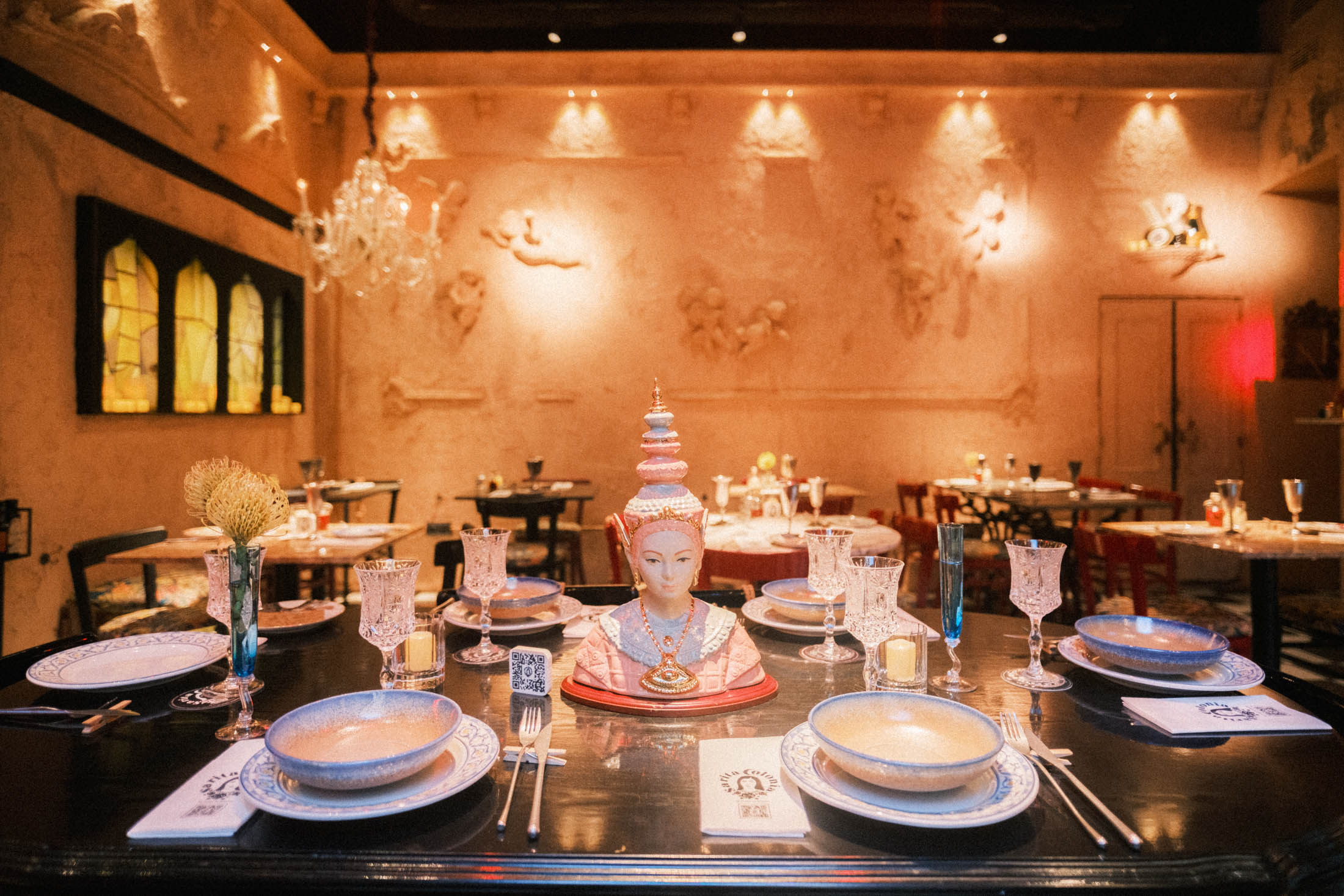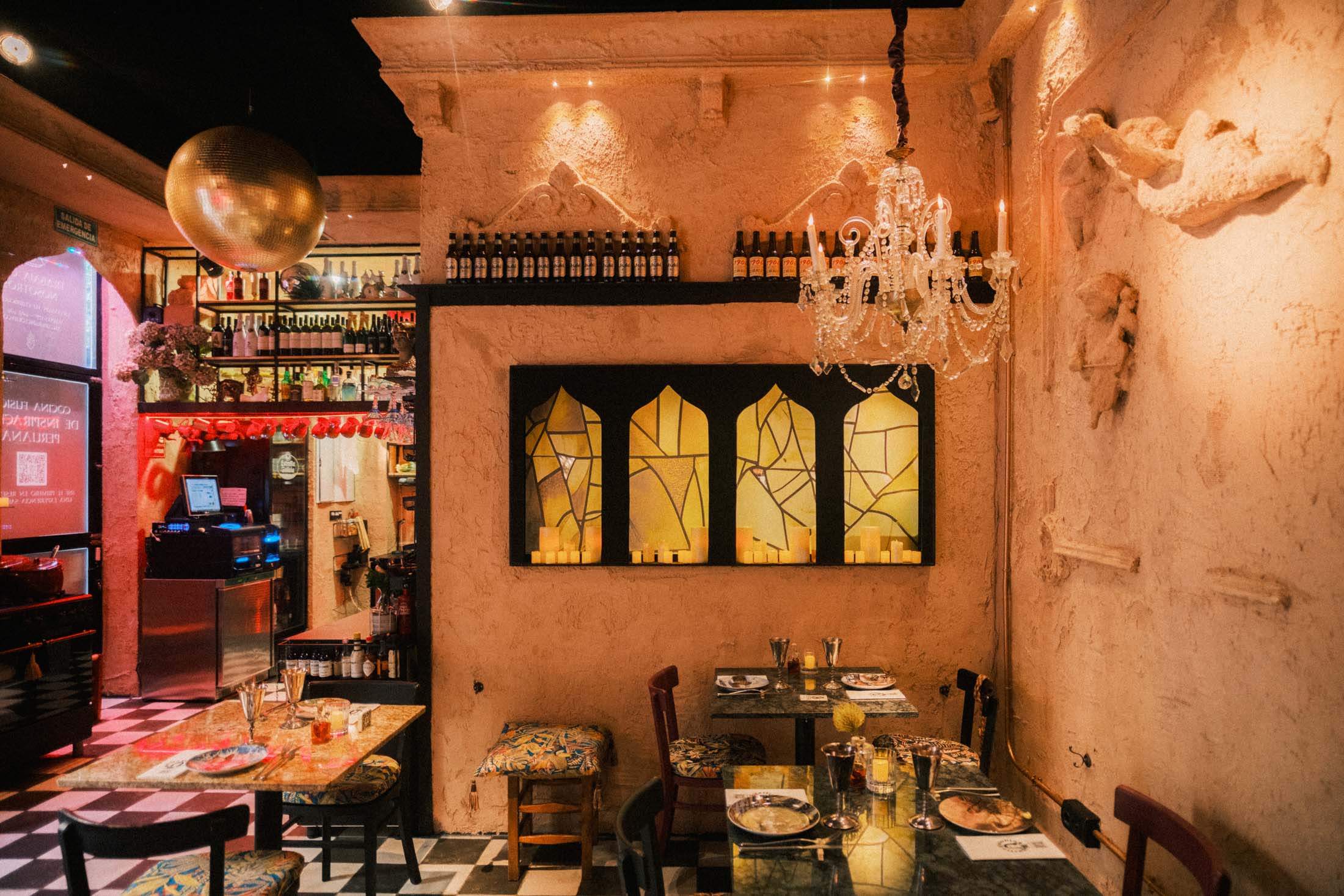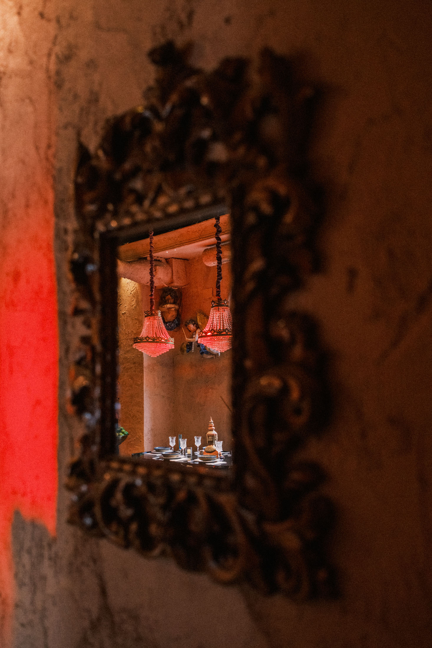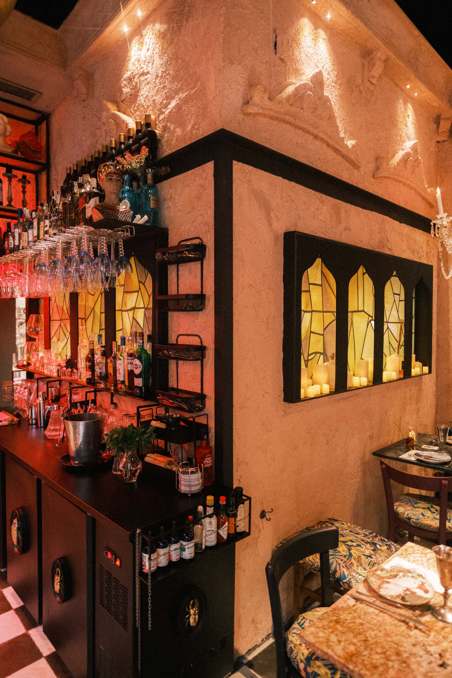 Cada rincón tiene su propia narrativa: la mesa imperial preparada con un menaje cuidado al detalle, el comedor íntimo con ventanales artesonados que conectan la cocina con la sala, o las luminarias isabelinas bañadas en rojo que juegan con lo místico y lo teatral. Los querubines en altorrelieve y el mobiliario diseñado a medida completan una atmósfera única, donde todo está pensado para sorprender.
