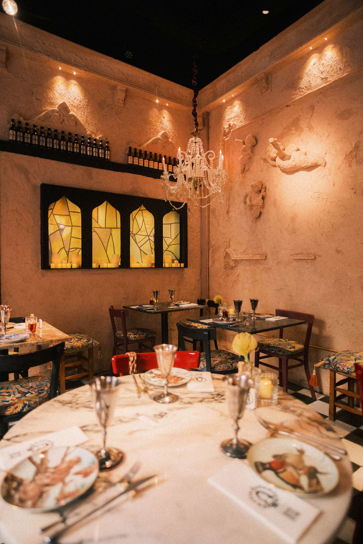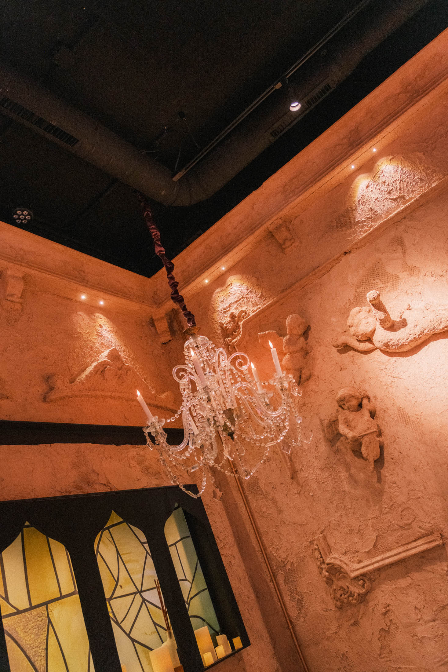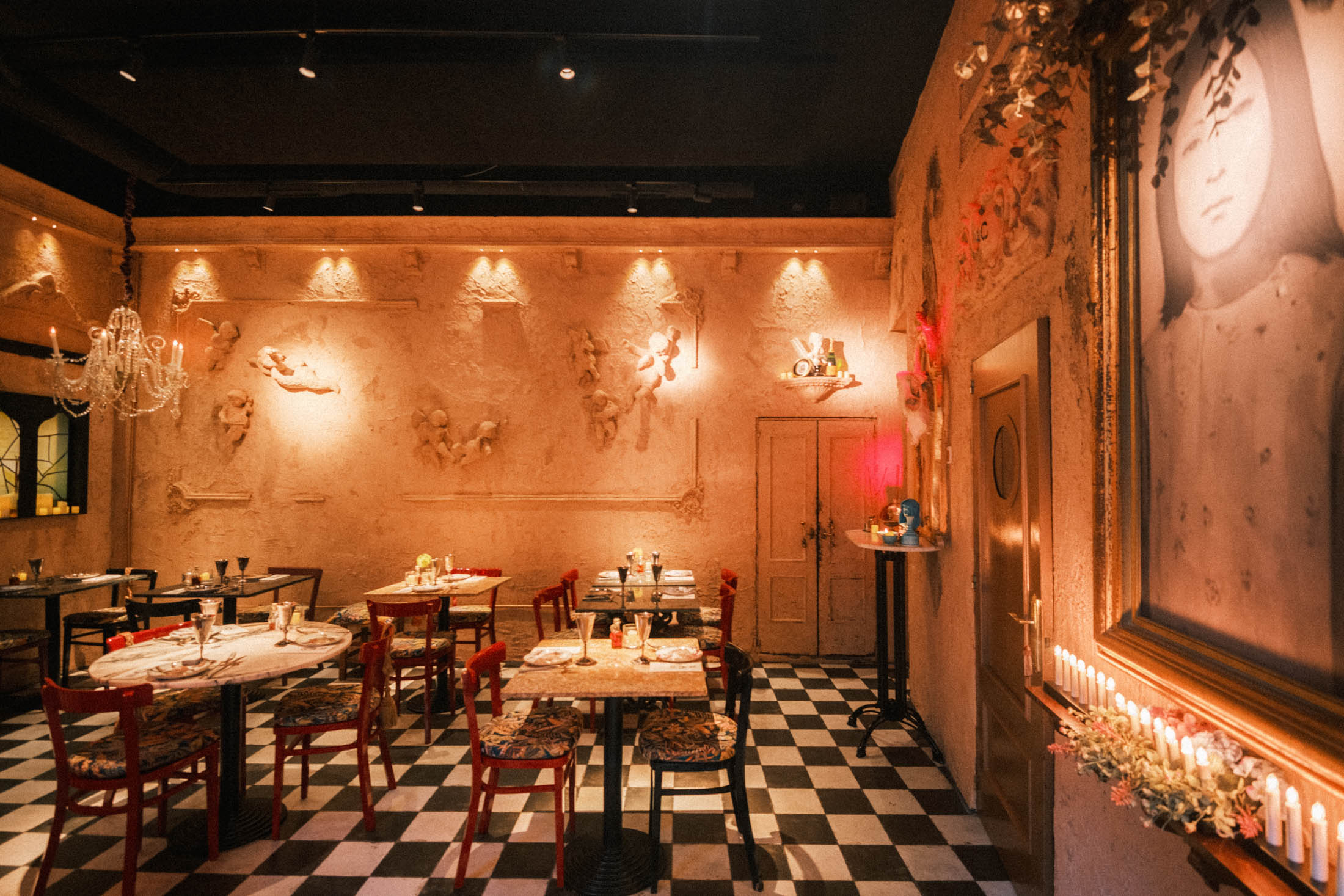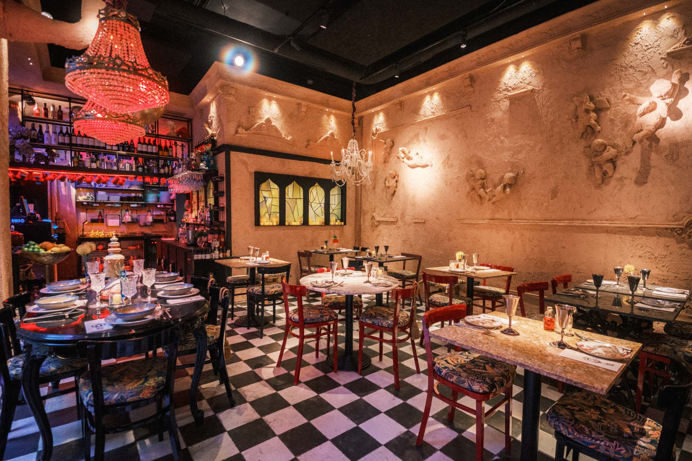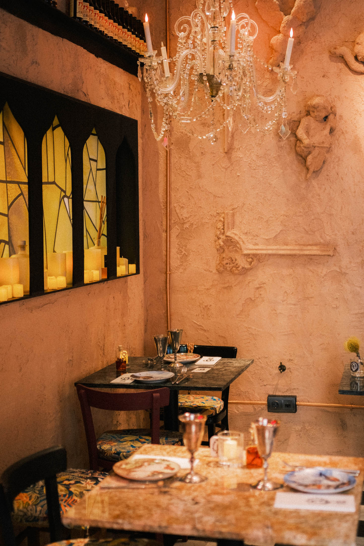 Cada rincón tiene su propia narrativa: la mesa imperial preparada con un menaje cuidado al detalle, el comedor íntimo con ventanales artesonados que conectan la cocina con la sala, o las luminarias isabelinas bañadas en rojo que juegan con lo místico y lo teatral. Los querubines en altorrelieve y el mobiliario diseñado a medida completan una atmósfera única, donde todo está pensado para sorprender.
