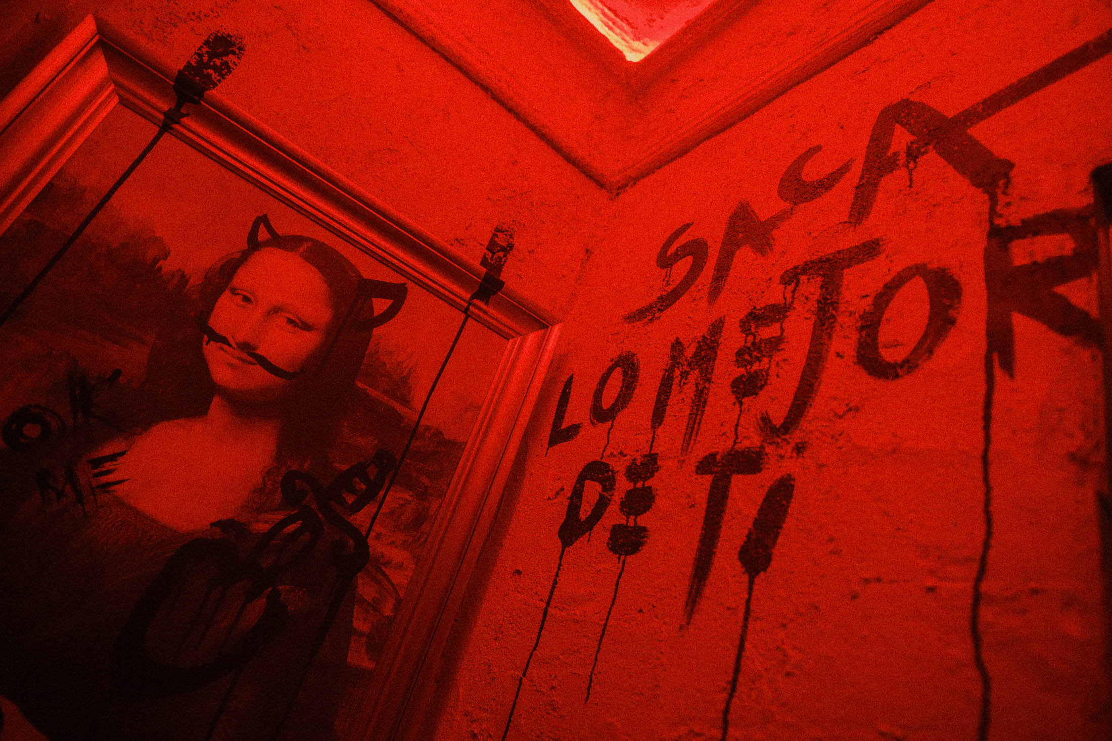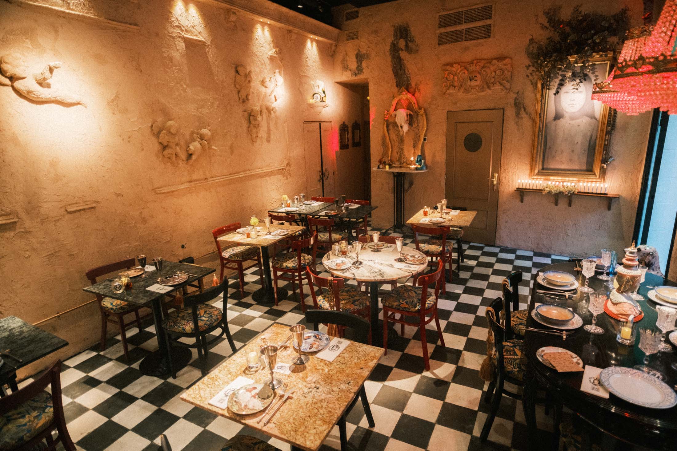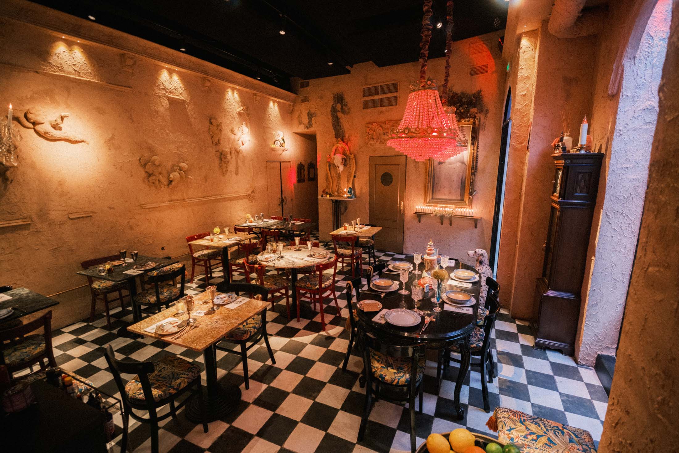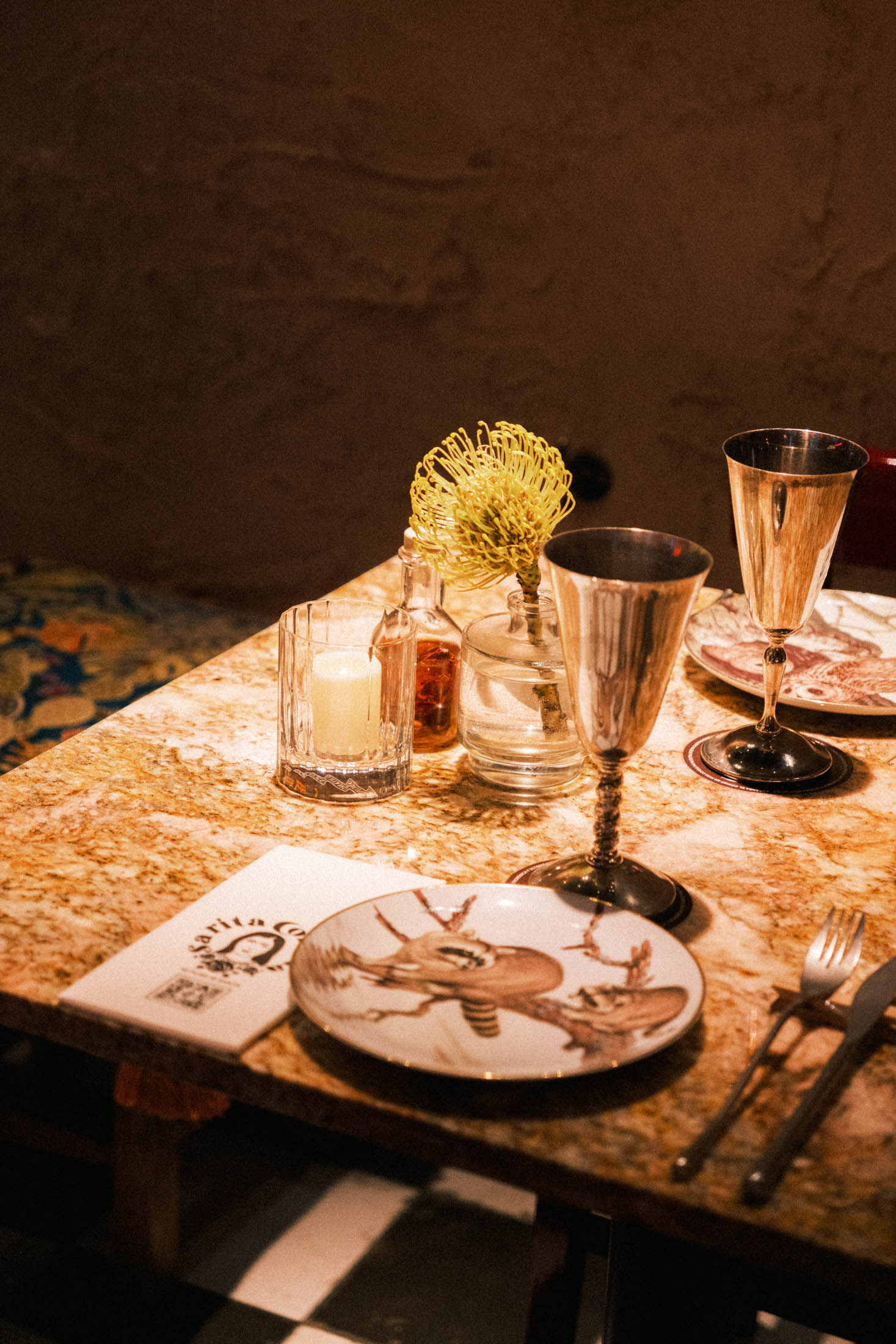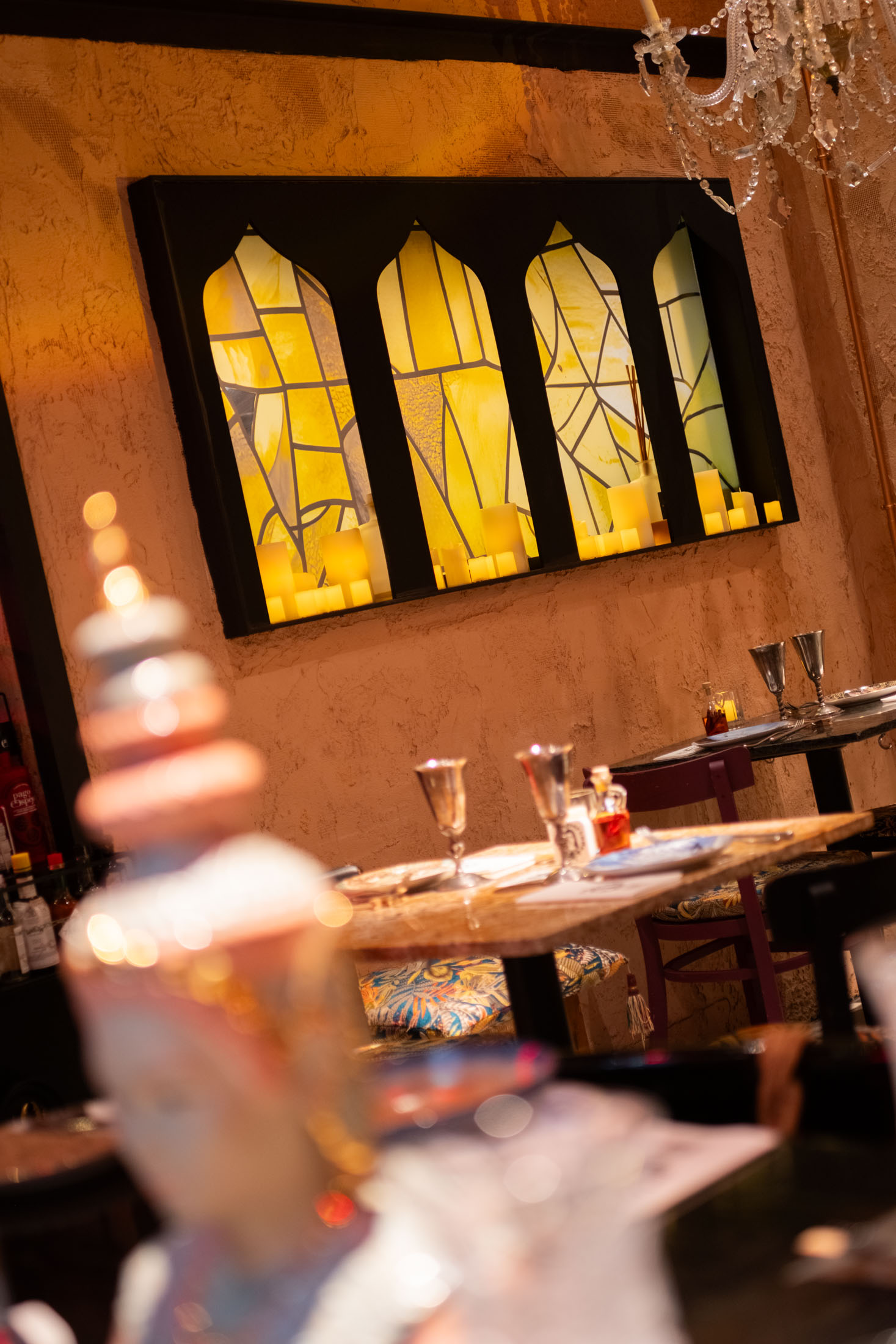 Cada rincón tiene su propia narrativa: la mesa imperial preparada con un menaje cuidado al detalle, el comedor íntimo con ventanales artesonados que conectan la cocina con la sala, o las luminarias isabelinas bañadas en rojo que juegan con lo místico y lo teatral. Los querubines en altorrelieve y el mobiliario diseñado a medida completan una atmósfera única, donde todo está pensado para sorprender.