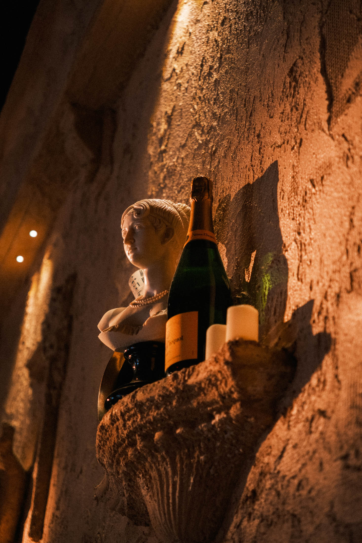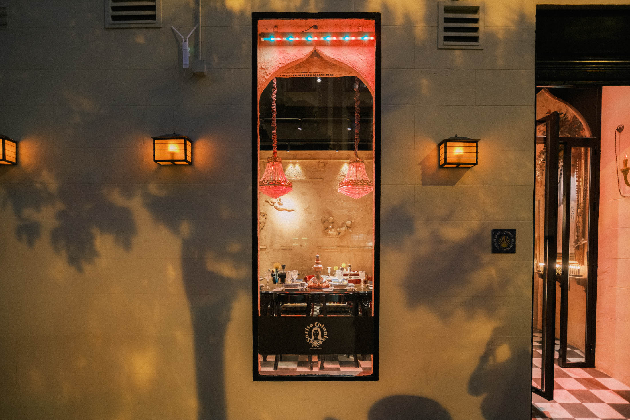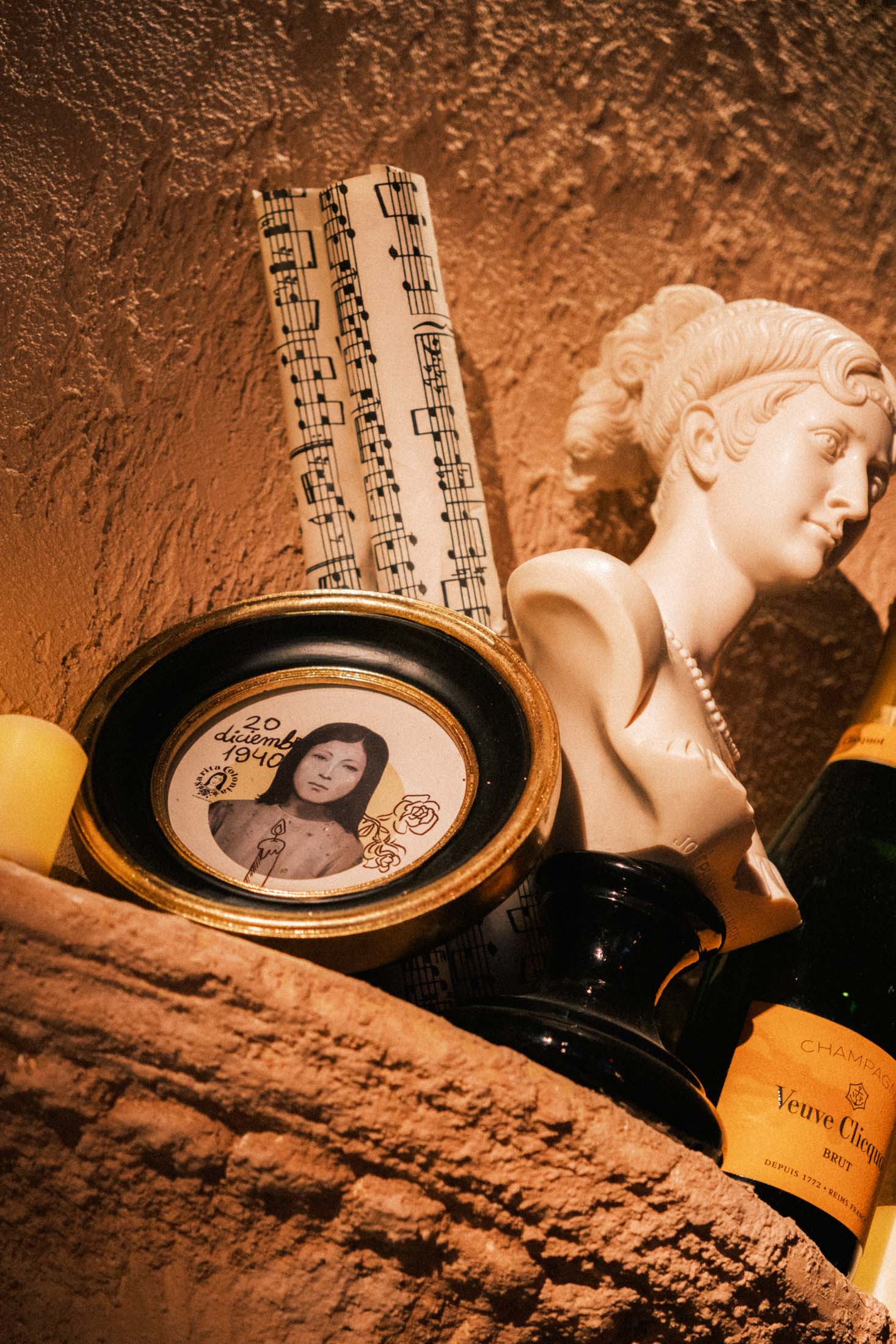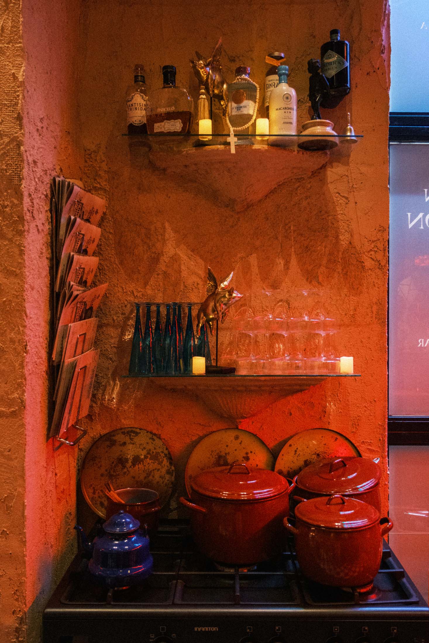 Cada rincón tiene su propia narrativa: la mesa imperial preparada con un menaje cuidado al detalle, el comedor íntimo con ventanales artesonados que conectan la cocina con la sala, o las luminarias isabelinas bañadas en rojo que juegan con lo místico y lo teatral. Los querubines en altorrelieve y el mobiliario diseñado a medida completan una atmósfera única, donde todo está pensado para sorprender.