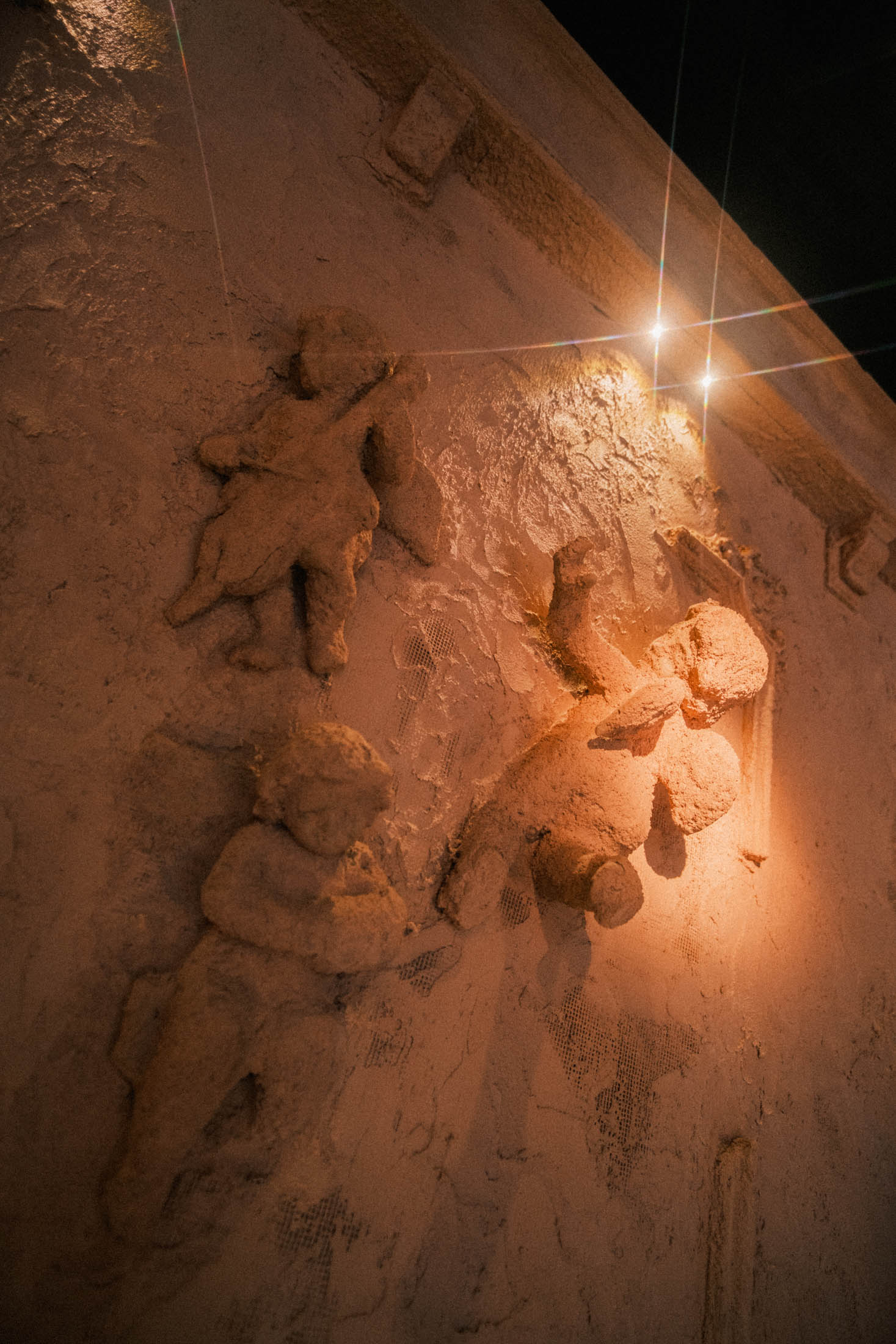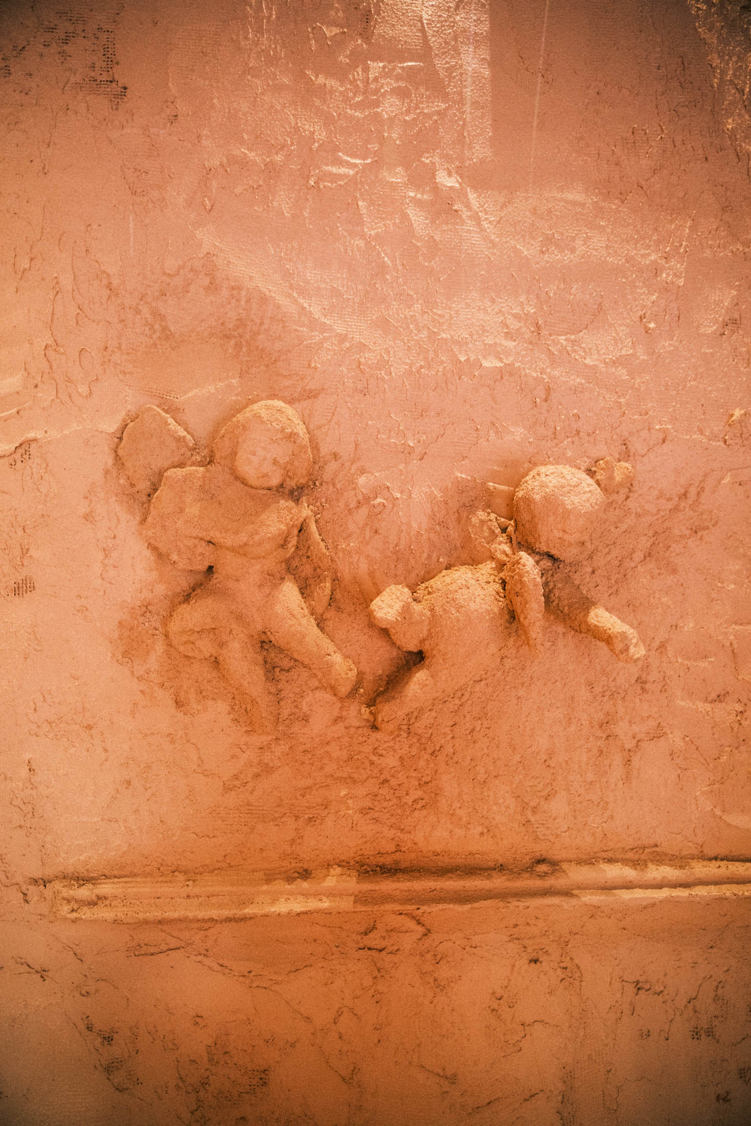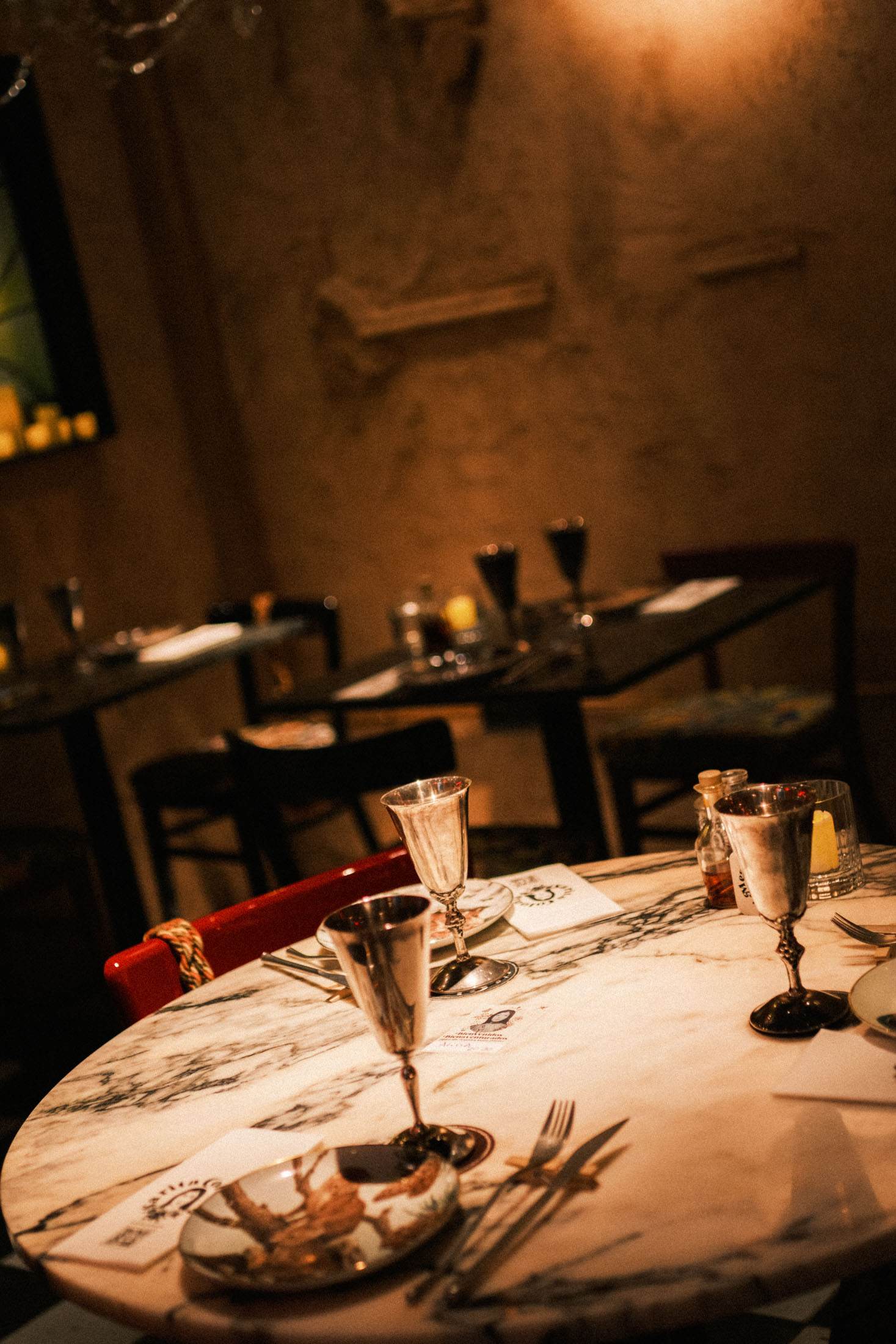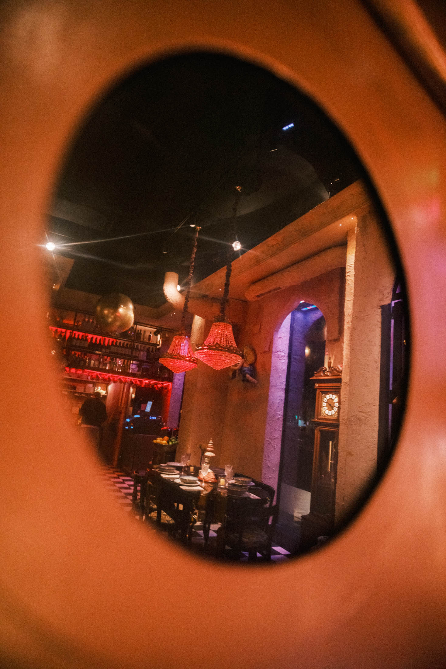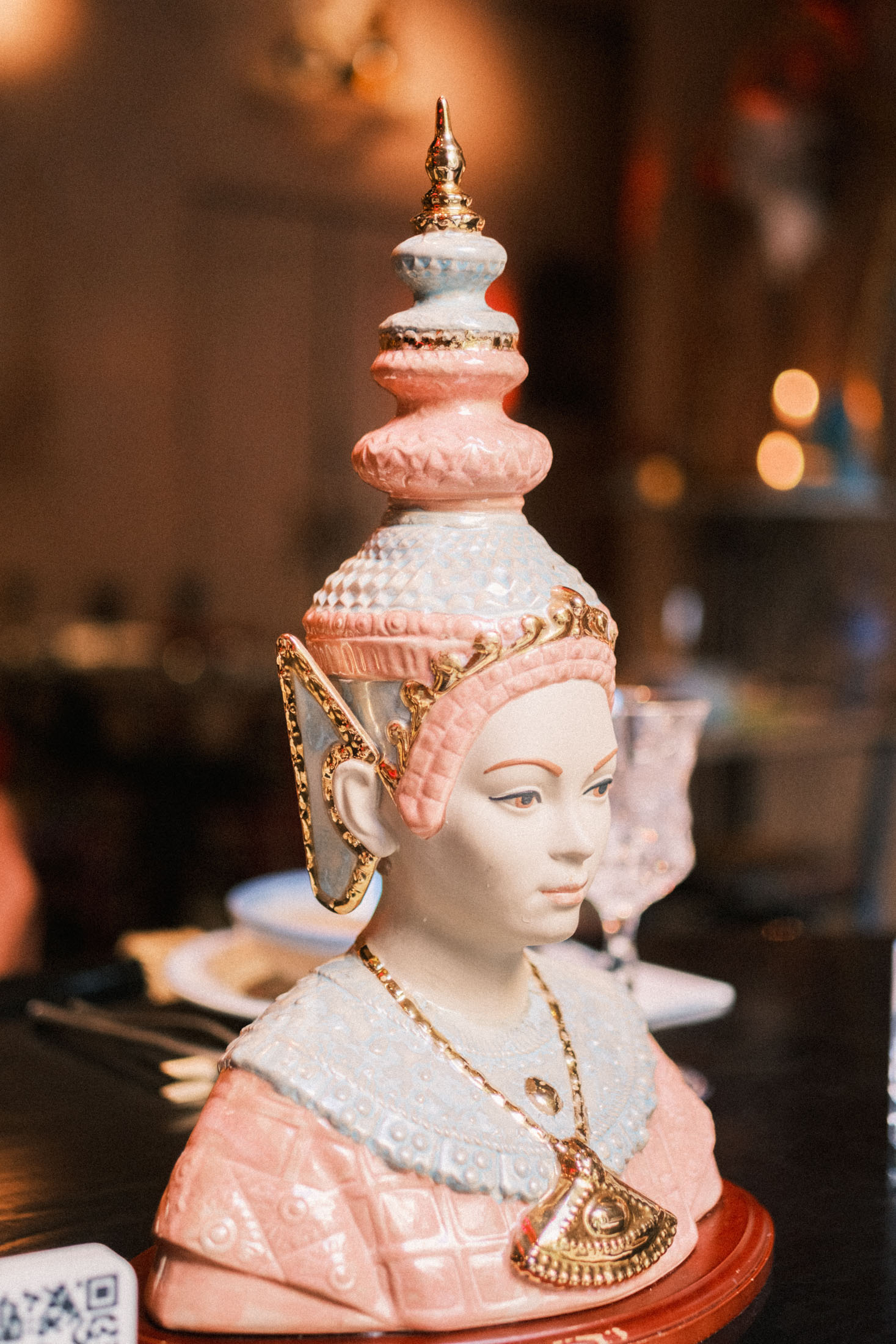 Cada rincón tiene su propia narrativa: la mesa imperial preparada con un menaje cuidado al detalle, el comedor íntimo con ventanales artesonados que conectan la cocina con la sala, o las luminarias isabelinas bañadas en rojo que juegan con lo místico y lo teatral. Los querubines en altorrelieve y el mobiliario diseñado a medida completan una atmósfera única, donde todo está pensado para sorprender.